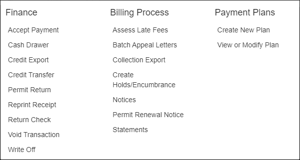 Clicking Finance opens a menu with links to the various Finance features in TickeTrak.