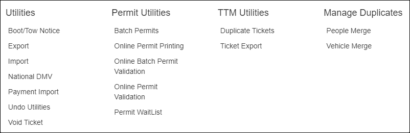 Clicking Utilities opens a menu with links to various Utilities. Utilities are features added to assist in day-to-day tasks, as well as to assist in cleaning up data in the event an error is made.