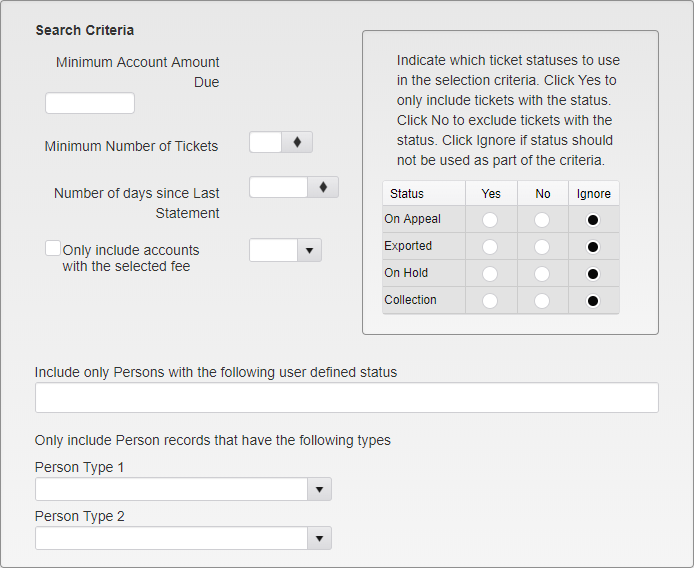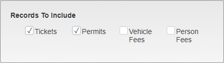 Select which record types to include in the Statement. Options are Tickets, Permits, Vehicle Fees, and Person Fees.