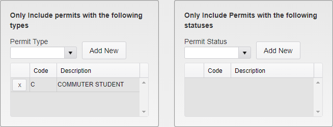 Select the Permit Types and Permit Statuses that this Permit Renewal Notice will cover. To remove a previously selected Type or Status, click the X button next to it. There is no limit to the number of Types or Statuses that can be selected.
