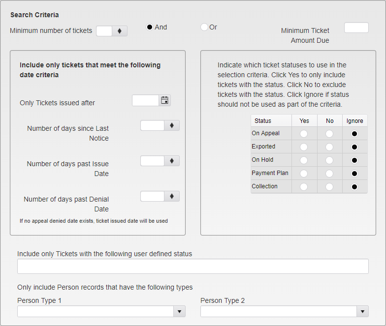 The criteria in this section only applies to Tickets. If Tickets are not included in the record selection, this section will have no effect on the records included in the Statement.