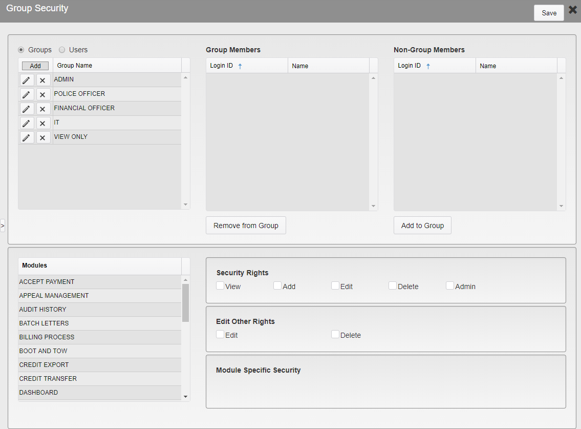 Note: Users must be set up in the Personnel module before they can be added to a Group. Only the users that have been added in Personnel will appear in the grid as a Non-Group Member that can be added.