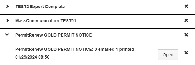 Notifications are grouped by Notification Type. Clicking the arrow next to a section will open the full list of those Notifications, allowing you to open any files generated and view other information they provide.