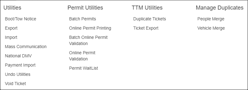 Clicking Utilities opens a menu with links to various Utilities. Utilities are features added to assist in day-to-day tasks, as well as to assist in cleaning up data in the event an error is made.