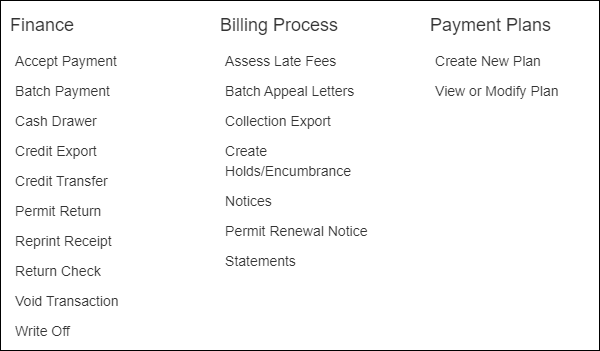 Clicking Finance opens a menu with links to the various Finance features in TickeTrak.