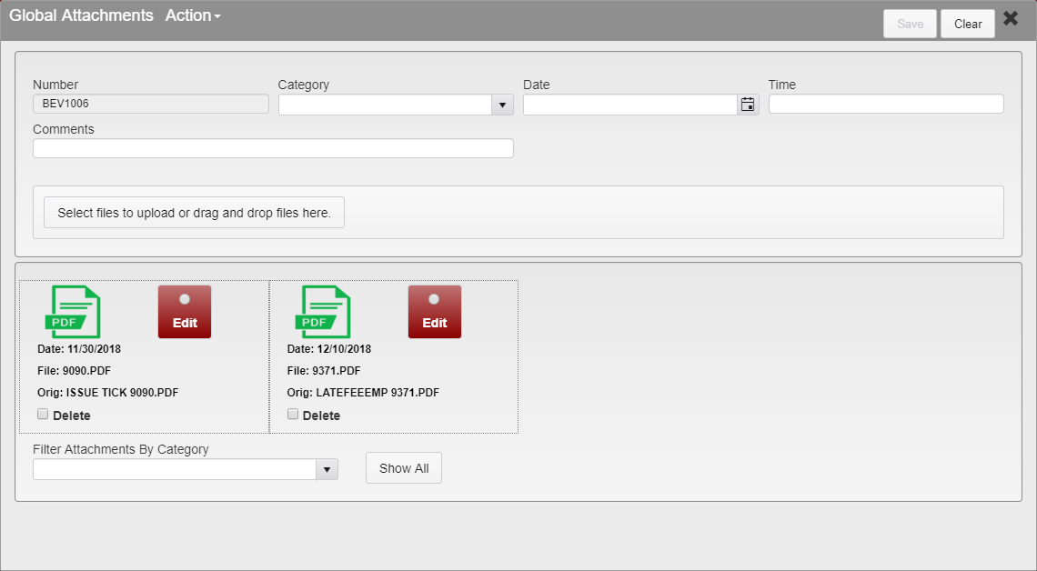 You can Filter Attachments By Category using the dropdown. This will show only the attachments that have that category. To return to the full list of attachments, click Show All.