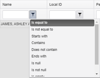The list can be filtered using the funnel icons and the search boxes next to them. Type in the boxes to search for specific strings. Click on a funnel icon to choose how the search filter will be applied. Each column has its own filter and does not affect the others.
