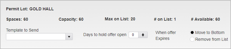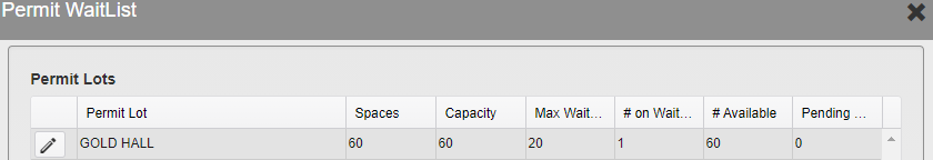 Permit Lots that have WaitList enabled are shown on the Permit WaitList utility. Each listing shows the name of the Lot, the total available spaces and capacity, and the maximum number of people that can be on the WaitList, all of which are set in System Settings. The listing also shows the number of people currently on the WaitList, the number of available spaces in the Lot, and the number of pending Permit Offers. These numbers update based on the active Permits attached to the lot and the contents of the WaitList.