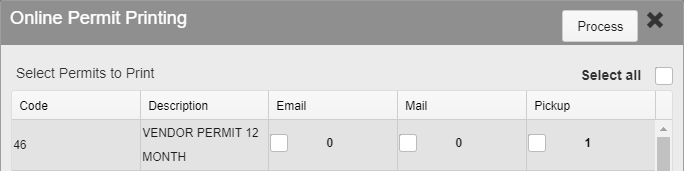 Each Permit type shows how many Email, Mail, and Pickup Permits are awaiting processing. Choose which Permit types to process, as well as the mailing type for each. Selecting one mailing type but not the others will only print the selected Permits. This allows, for example, Emailed and Mailed Permits to be sent and printed, while Pickup Permits are left unprinted until the Person comes to receive them.