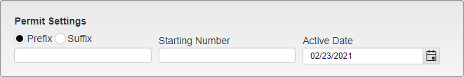 Select if the Permits will have a Prefix or Suffix on them, and enter the text to be used. Enter the Starting Number for the Permits. The Active Date is automatically set to the current date but can be changed.