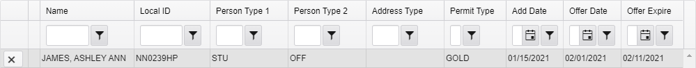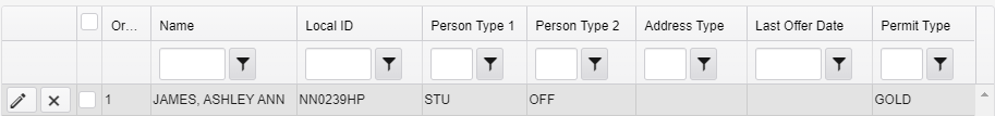 Regardless of how they were added, people currently on the WaitList are shown on the WaitList tab. The Name, Local ID, Person Type 1 and 2, and Address Type are pulled from their Person information. The Permit Type is the Permit they requested. The Last Offer Date is the last time the Person was sent an offer off of this WaitList.