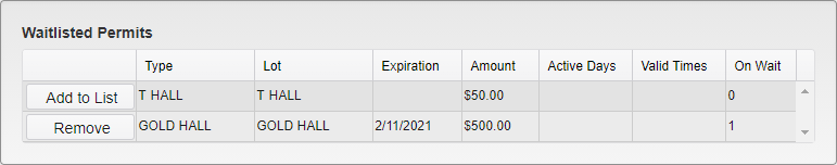 The WaitList allows you to create a list of people waiting on specific Permits for future approval. These are Permits where the related Lot has filled up or the maximum number of that Permit have been sold. WaitList allows users to pre-emptively be listed for consideration if a Permit is returned.