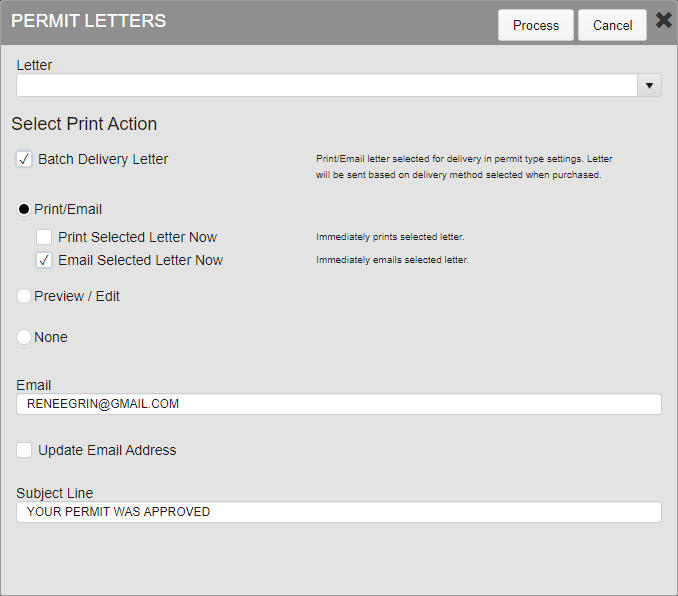 After you Accept a Permit, you will be prompted to Print or Email a Letter to the Person.