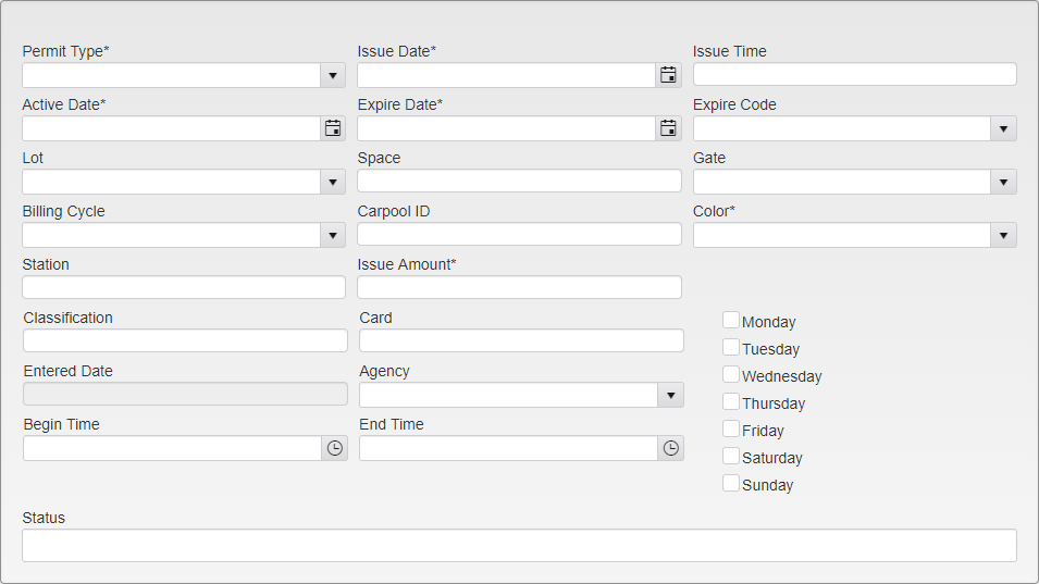 Select the Permit Type, Issue Date, and any other required information for creating a Permit. These fields are identical to those found in the main Permit module.