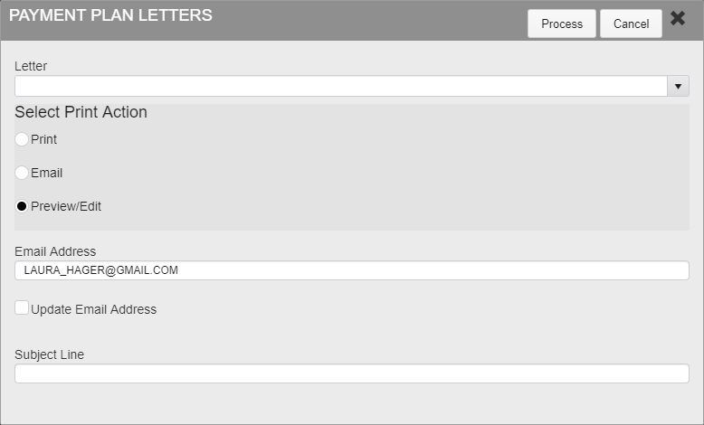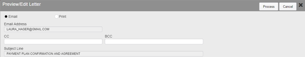 Once the letter has been edited, select if it will be Emailed or Printed. If it is being emailed, additional emails can be entered as carbon copied or blind carbon copied to additional recipients. When all edits and additions have been made, click Process to send or print the letter.