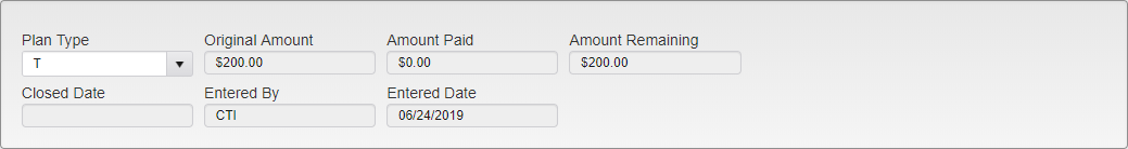 The Plan Type can be changed from Self Pay to Payroll Deduction or vice versa. The Amount Paid and Amount Remaining will automatically update whenever a payment is made. The Closed Date will automatically fill in when the Payment Plan is either paid off or has been closed manually.