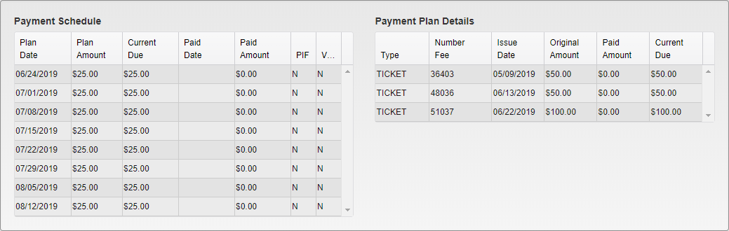 Payment Plan Details shows a list of all of the items that are part of the Payment Plan and the amounts paid and remaining on them.