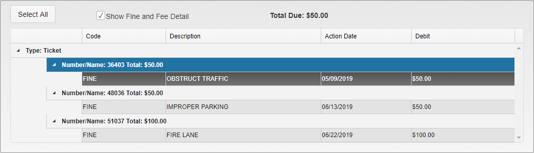 You can click Select All to quickly select all of the items. Uncheck the Show Fine and Fee Detail box to collapse the information on all of the items. Total Due shows the current total of the selected items.
