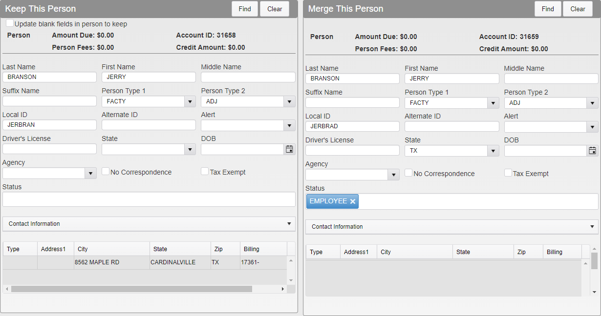 The People Merge utility is used when there are duplicate records of the same Person in the system. This allows you to review both records side by side so that they can be merged into one and reduce the number of duplicates in the system.