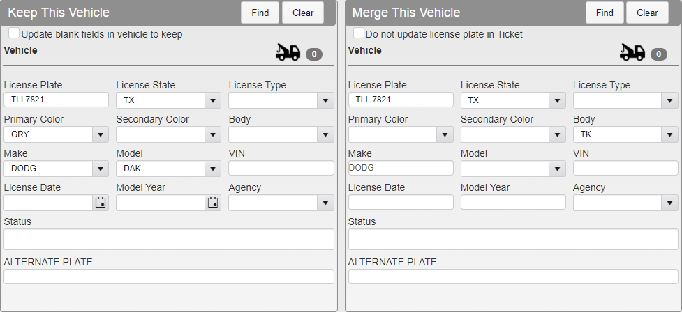 Verify that the plates are correct. Checking Update blank fields will fill in blank fields in the entry being kept with information from the entry being merged. Click Merge.